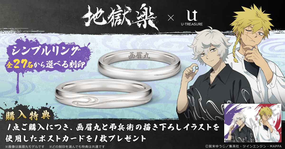 TVアニメ『地獄楽』 モチーフリング シルバー 予約受付中 ¥17,600(税込) TVアニメ『地獄楽』 モチーフリング プラチナ 予約受付中 ¥198,000(税込) TVアニメ『地獄楽』 描き下ろしアクリルリングスタンド 予約受付中 ¥2,200(税込)