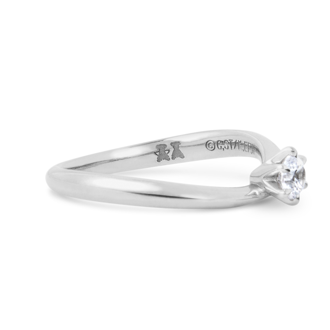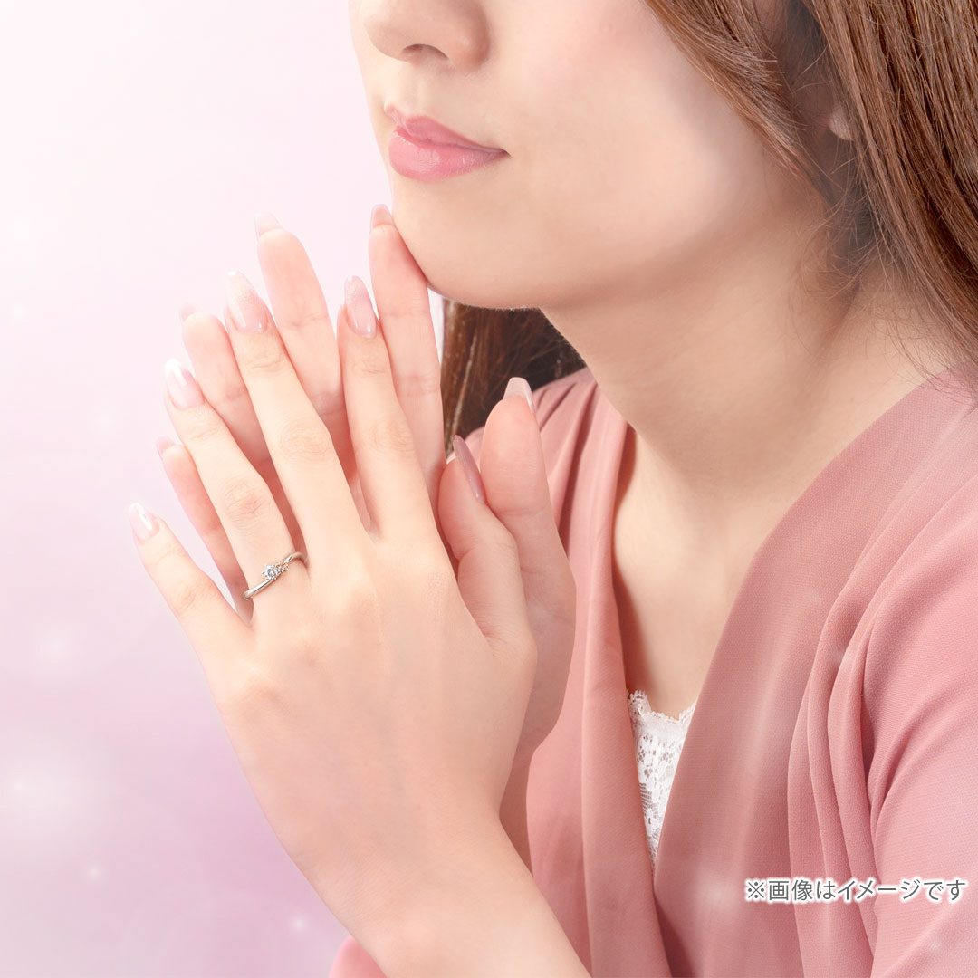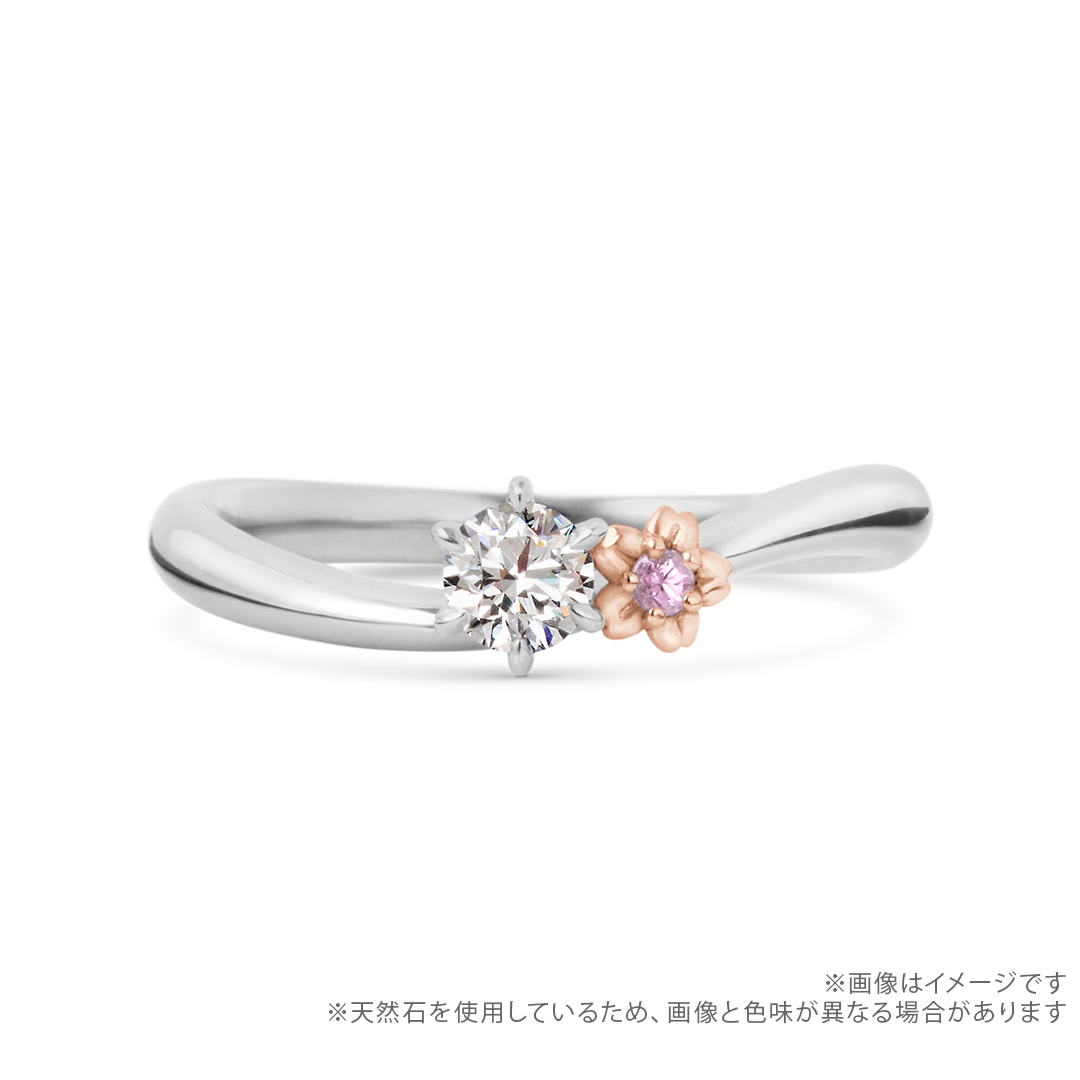 センターストーンに寄り添うように留めたピンクサファイアがアクセントのモチーフリング。桜の花びらが舞い落ちる軌跡を描いた様なアームラインは手元に柔らかな印象を与えてくれそう……。