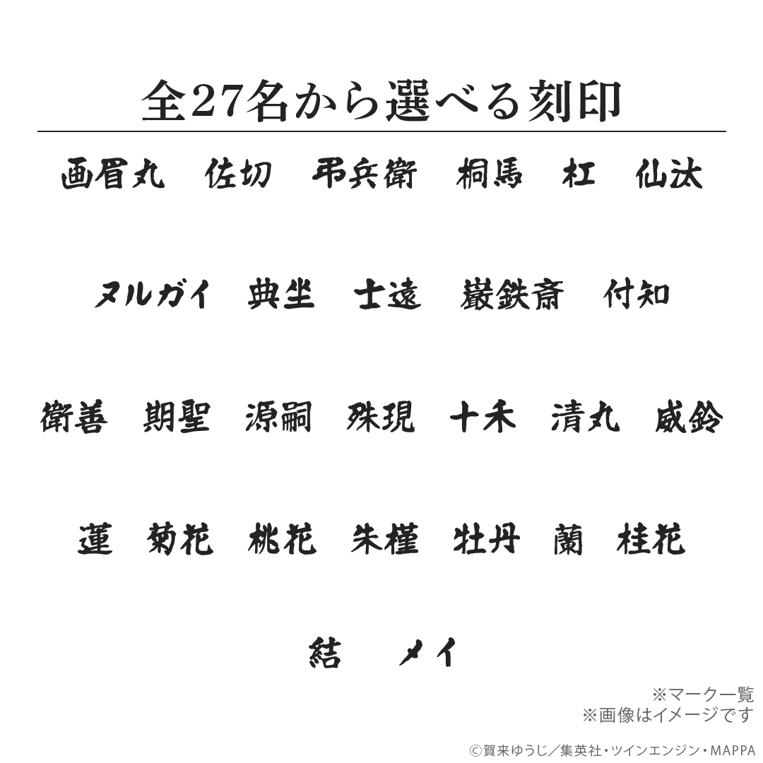 内側には「画眉丸」「佐切」「弔兵衛」「桐馬」「杠」など、27名の中から選んだキャラクターの名前を刻印します。