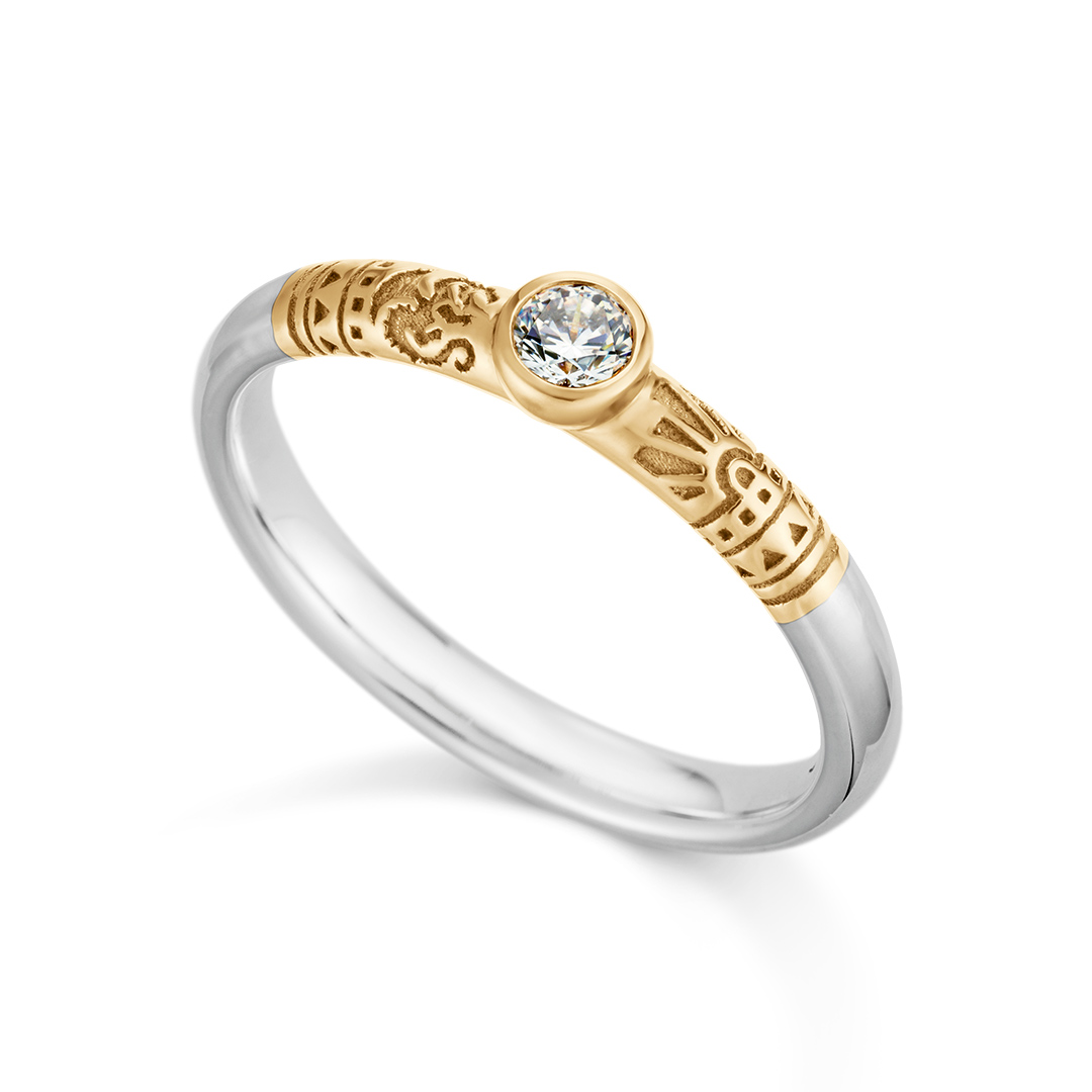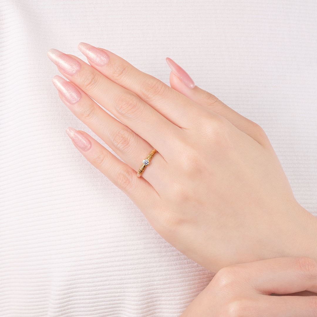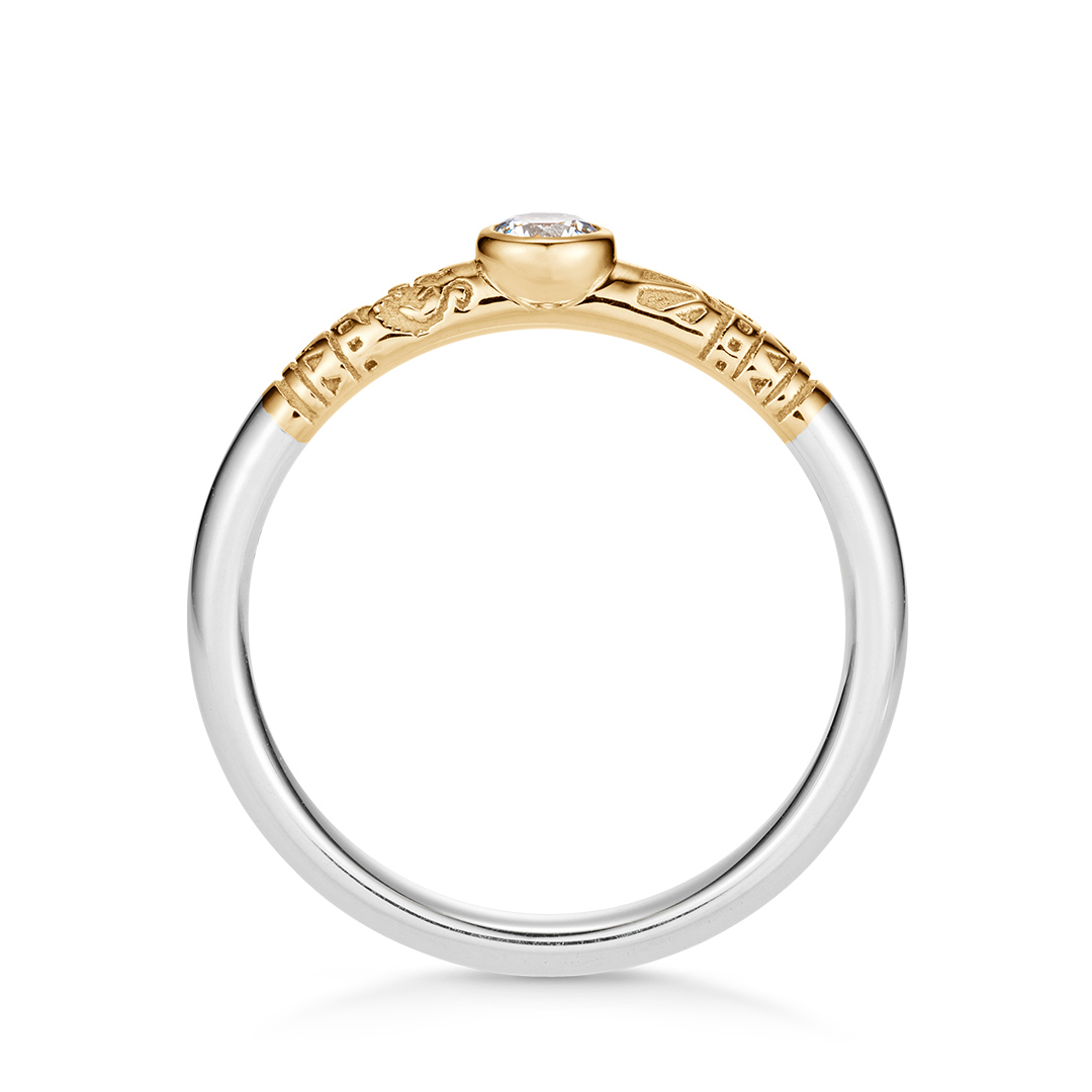 プラチナ950とK18イエローゴールドの2種類の金属を使用したリングの中心には0.1ctのダイヤモンドが輝きます。