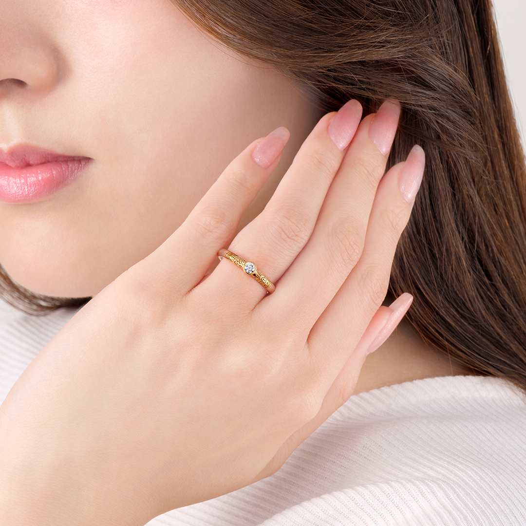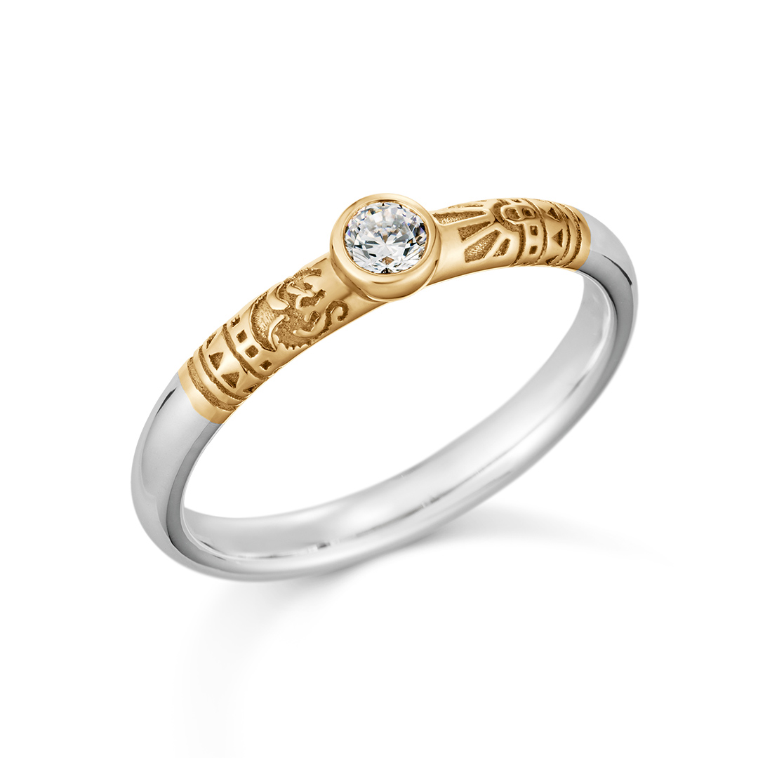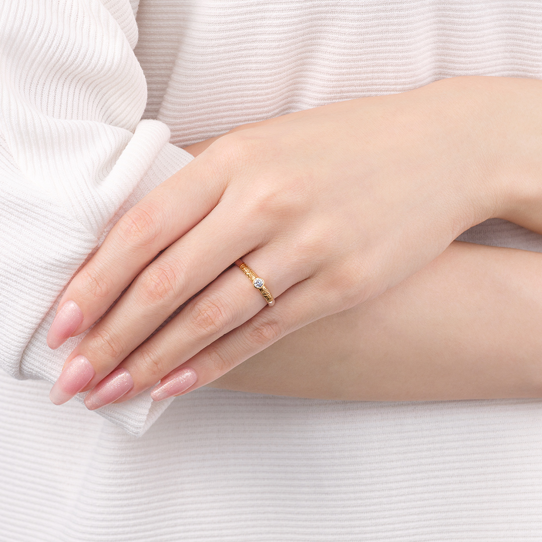 プラチナ950とK18イエローゴールドの2種類の金属を使用したリングの中心には0.1ctのダイヤモンドが輝きます。
