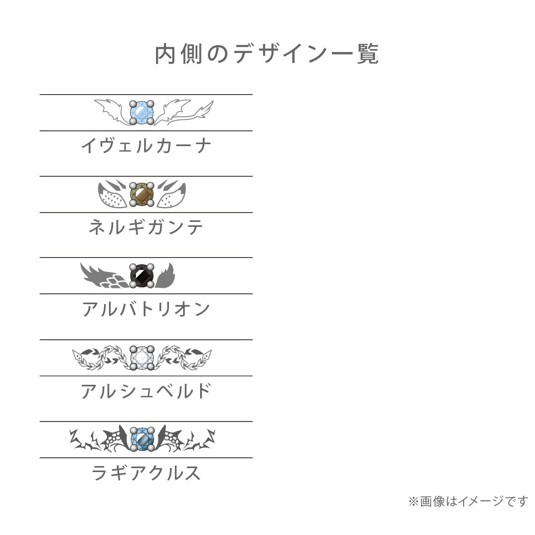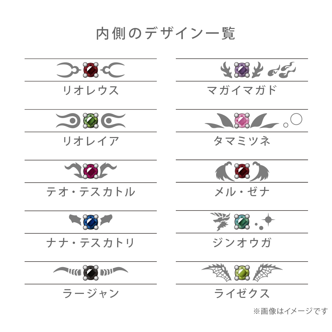 リングの内側にはそれぞれのモンスターをイメージしたマークの刻印と、カラーストーン(天然石)をあしらった贅沢なデザインです。